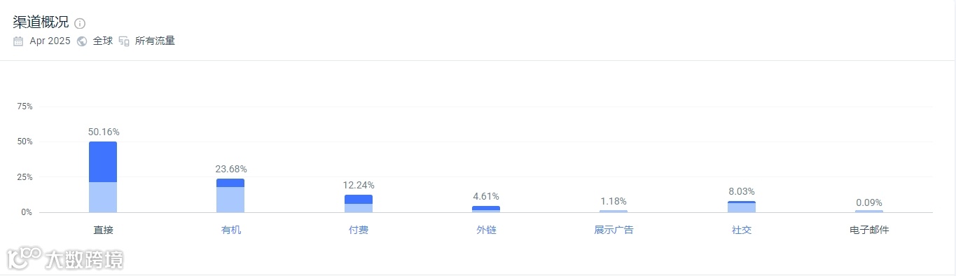 根据similarweb数据显示,The Citizenry官网的流量主要来自于直接访问流量(50.16%)、自然搜索流量(23.68%)、付费搜索(12.24%)、社交媒体(8.03%)。