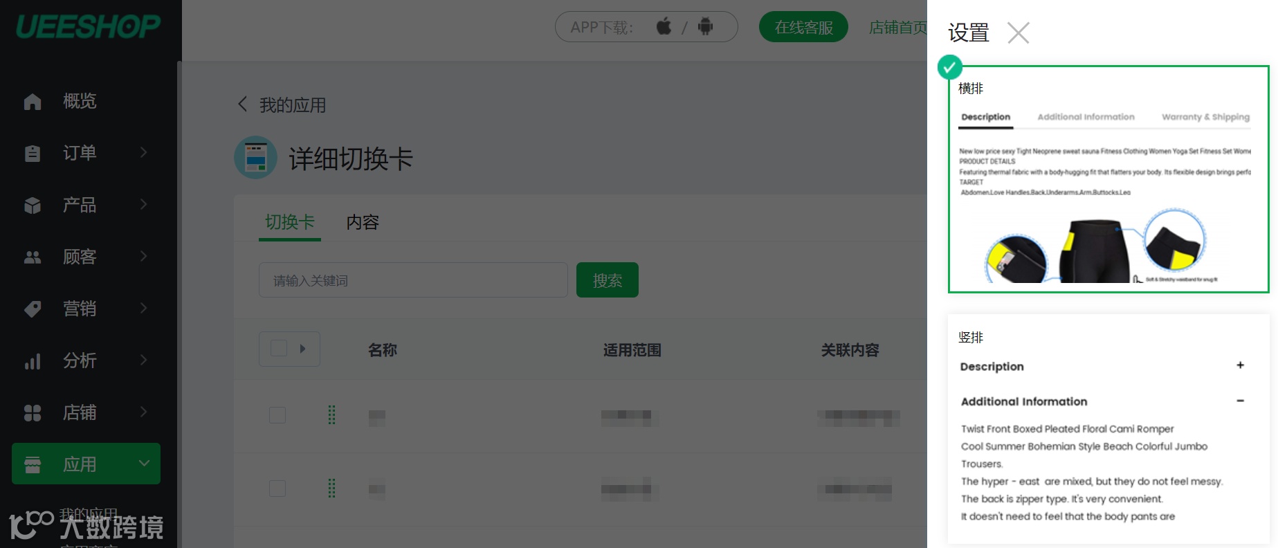 Ueeshop详细切换卡功能,可添加多个产品描述,帮助卖家更加全面地展示产品不同方面的信息,方便消费者查看,进而提升消费者信任度。