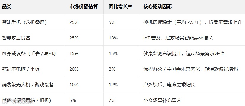 - 其他品类(消费级无人机、游戏设备、便携音箱等):占比约 15%,达720 亿美元。