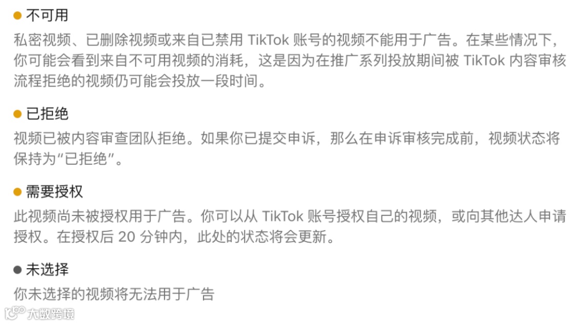 联盟作品:达人在联盟广场推广店铺商品所发布的视频,需已挂载商品链接。注意必须同时满足“已授权+单店铺链接+允许广告投放”条件,系统才会抓取。需确保达人已开启广告授权并勾选对应店铺或商品,且视频不可同时挂载多店链接。