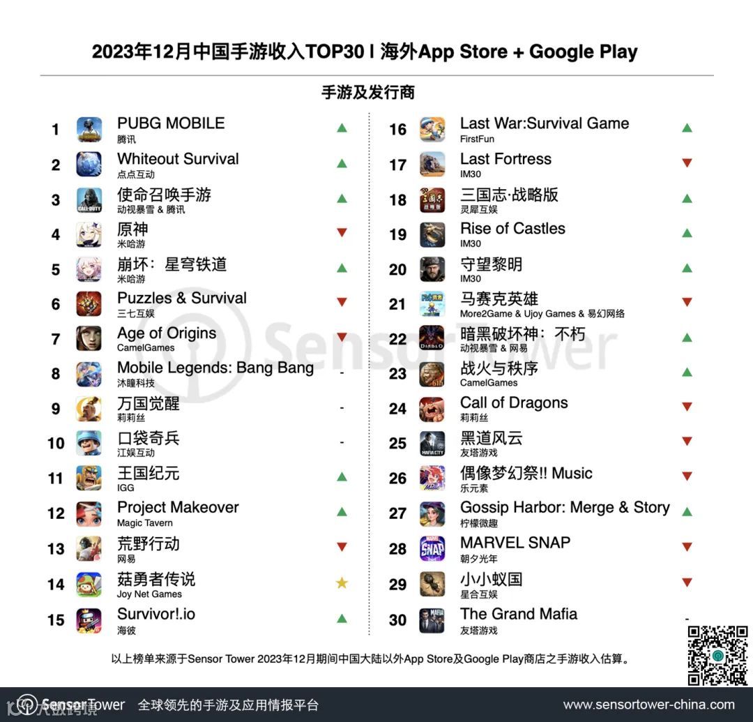 · 2023年12月成功出海的中国手游 - 《PUBG Mobile》登顶收入榜,《Whiteout Survival》收入创新高