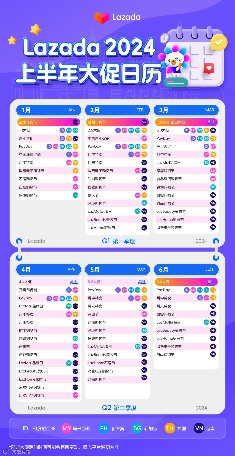 2024年1月-2月,大促活动有越南年货节、1.1大促、新年大促、PayDay、中国新年促销、月中特卖等;2024年3月-4月,大促活动有Lazada生日大促、3.3大促、斋月大促、LazMall品牌日、家居购物节、食品杂货购物节等;2024年5月-6月,大促活动有5.5大促、劳动节、跨境购物节、母婴购物节、LazBeauty美妆节、LazHome家居节等。