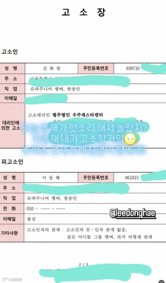 공개된 사진에는 김희철이 법무법인 우주대스타엔터를 고소대리인으로 선임하고, 피고소인을 동해로 명시한 내용이 담겼으며, 두 사람의 관계를 "같은 아이돌 그룹 멤버, 과거 의형제 관계"라고 기재했다.