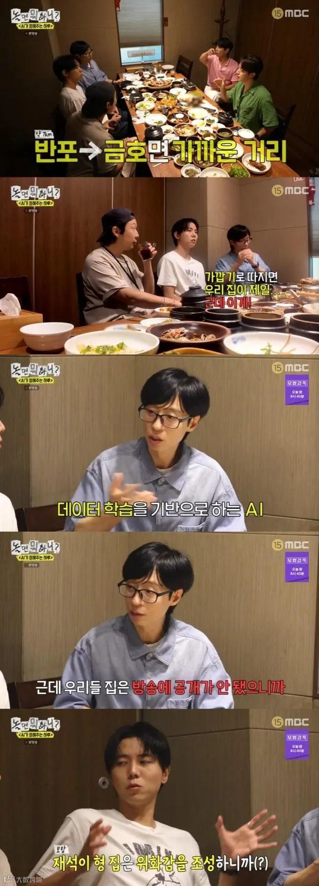 이에 유재석은 “가깝기로 따지면 우리 집이 제일이지만, 우리 집은 방송에 공개된 적 없으니까 AI가 학습하지 못했을 것”이라고 말했다. 주우재는 “재석이 형 집은 위화감 조성한다”며 장난을 건네 웃음을 자아냈다.