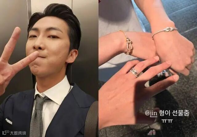 9月12日,RM发布动态写道:“珍哥送的礼物ㅠㅠ”,并晒出佩戴戒指的照片。画面中,他将戒指戴在左手无名指上,身旁还可见金硕珍的手腕。