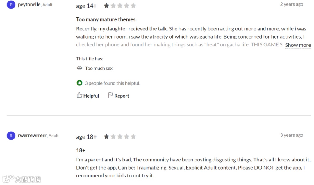 (图:海外玩家对《Gacha Life》的低分评价,强烈呼吁提高游戏年龄限制)