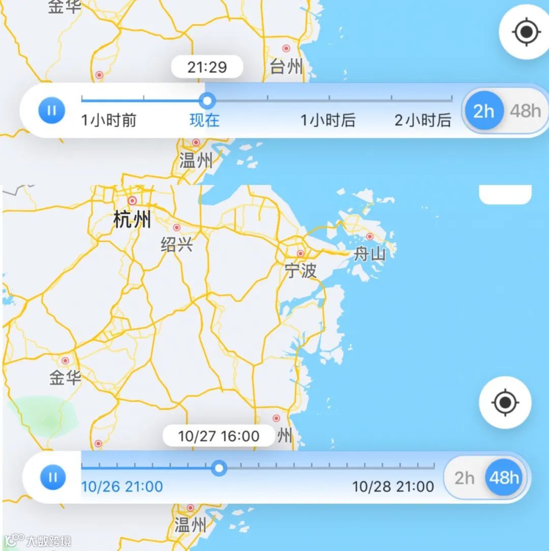墨迹天气在这一块区域的设计是我相对来说比较喜欢的,操作上可以算是一气呵成。其实,墨迹整体的产品视觉设计是带有不少细节的。如果你仔细拆解过的话,你可以注意到他们雨势地图里针对2小时预报和48小时预报的横轴展示是很人性化,很拿捏正常人思考时的第一思考维度。