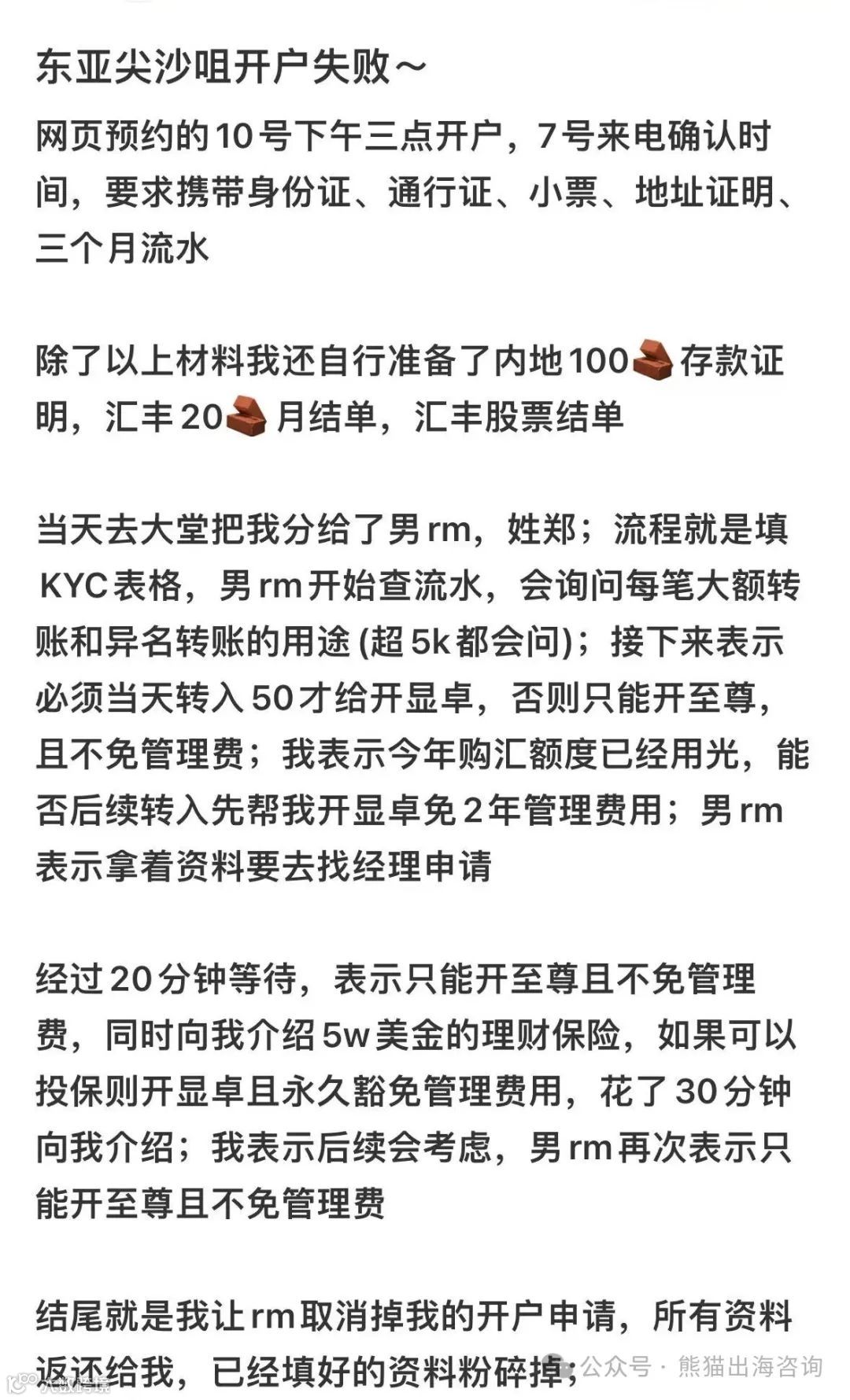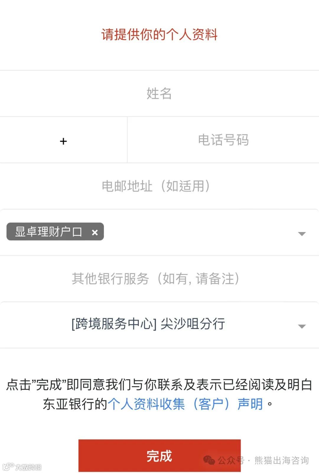 1. 通过公众号预约:可以通过东亚银行香港的微信公众号进行预约,需要填写个人资料,等待香港东亚银行确认预约时间。但据小红书上的一些评论,尖沙咀网点要求较高,可能需要额外的材料,如近一个月的银行流水、资产证明等。