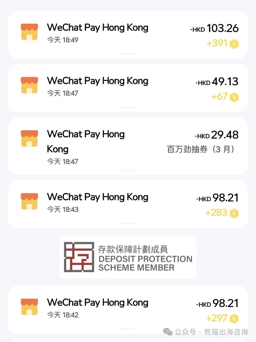 众所周知大陆支付宝/微信绑卡消费时,200以下免手续费,200以上3%手续费。用香港微信钱包以港币支付,超过200也没有3%手续费。