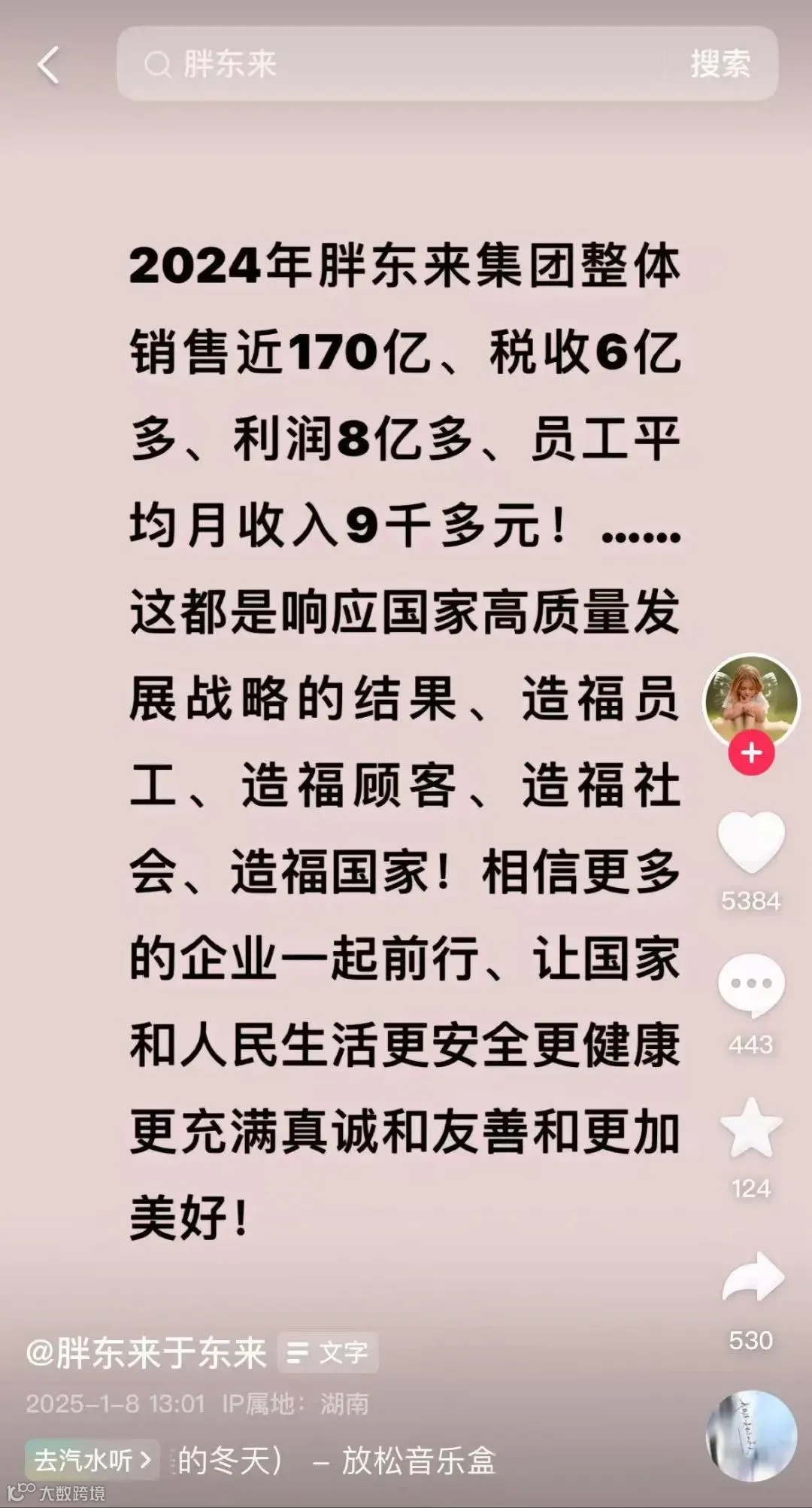 1月8日,胖东来创始人于东来在社交平台上公布,2024年胖东来集团整体销售近170亿元、税收超6亿元、利润超8亿元、员工平均月收入九千多元。