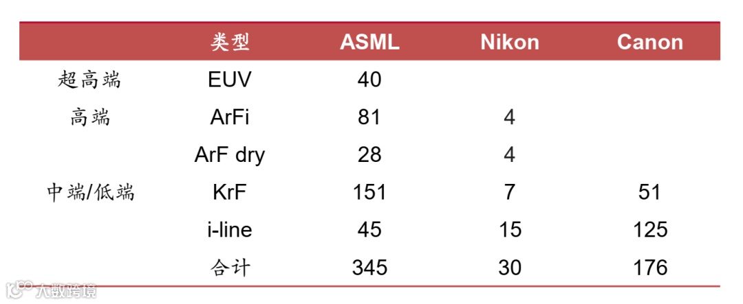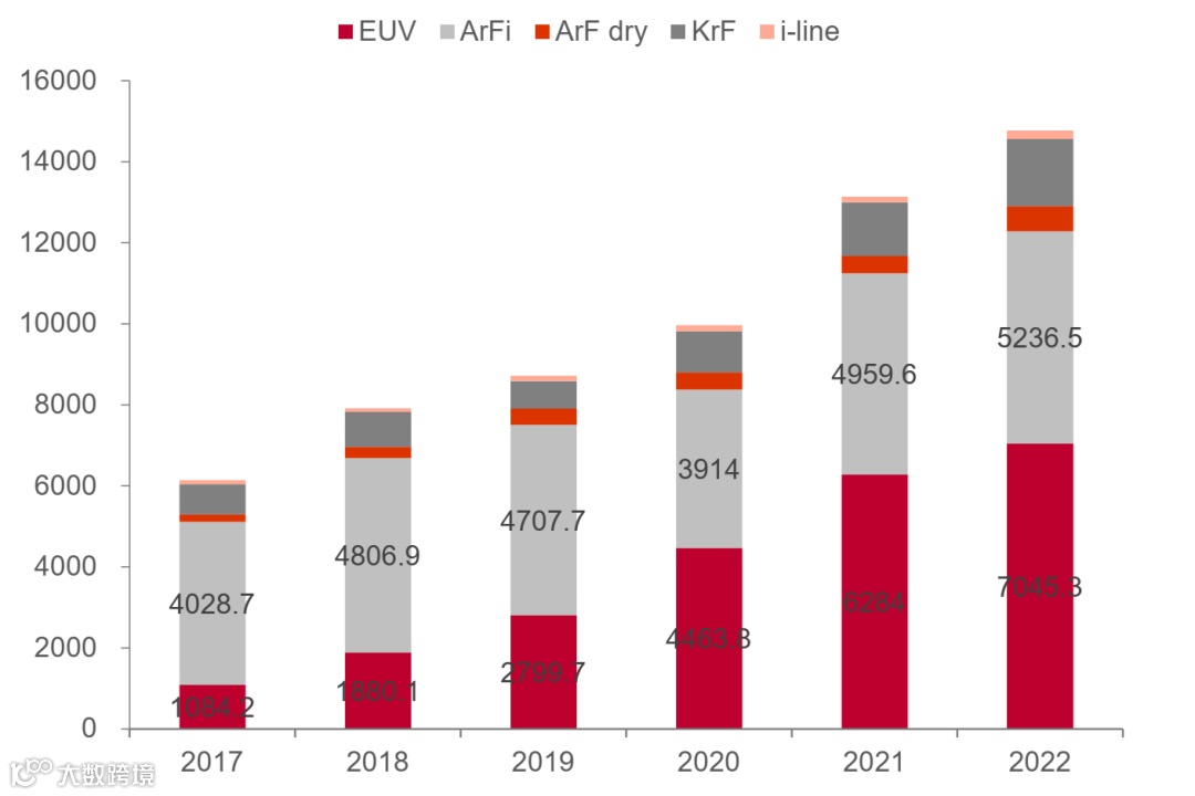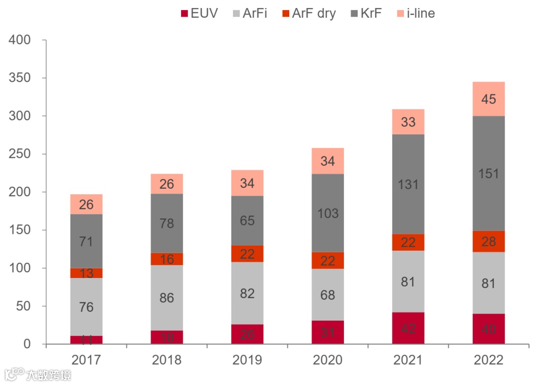 2022年,EUV光刻机销售额占ASML前道光刻机总收入近50%,ArFi机型占35%。尽管KrF出货量最大,但EUV和ArFi作为高端机型,是推动ASML营收增长的核心动力。
