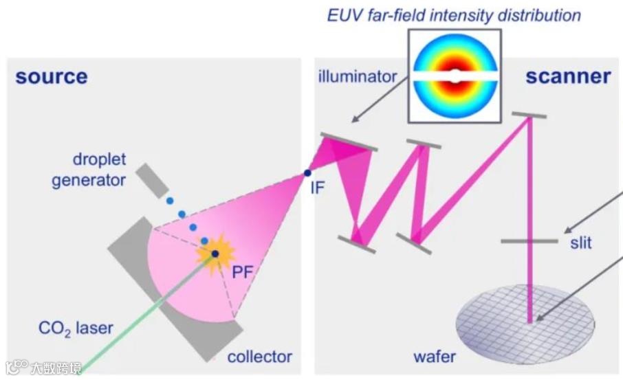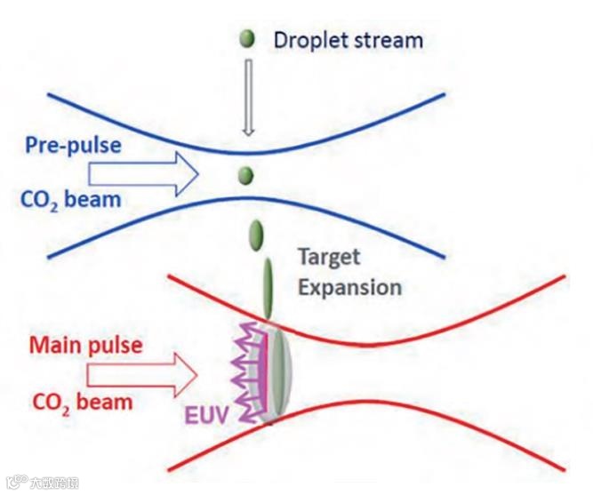 - 极紫外(EUV):13.5nm,通过高能CO₂激光轰击锡滴产生等离子体发光。