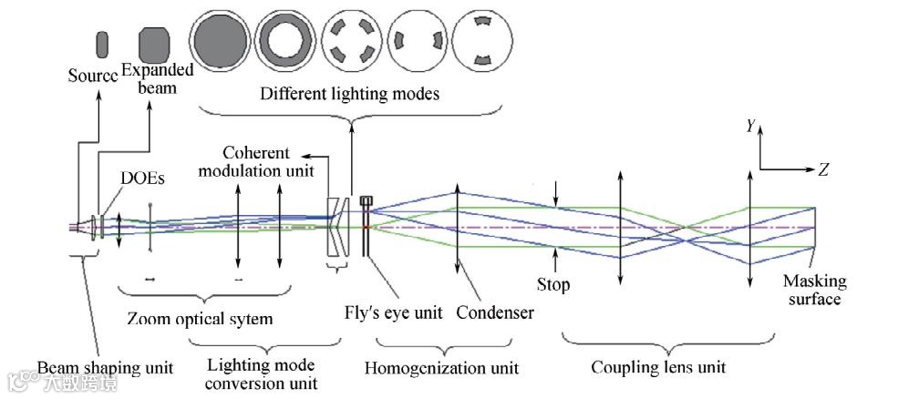 位于光源与物镜之间,功能包括光束处理、光瞳整形、匀化、偏振控制等。