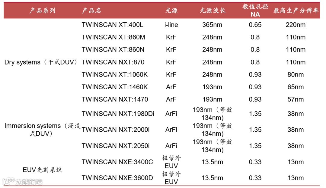 ASML产品覆盖i-line、KrF、ArF干式/浸没式及EUV光刻机,光源波长最小达13.5nm,分辨率可达13nm,经多重曝光可支持5nm/3nm制程,是目前全球唯一具备EUV光刻机生产能力的企业。