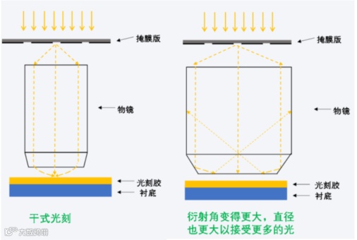 干式光刻:光从物镜进入空气发生衍射,角度变化影响成像,线宽缩小后难以满足需求。