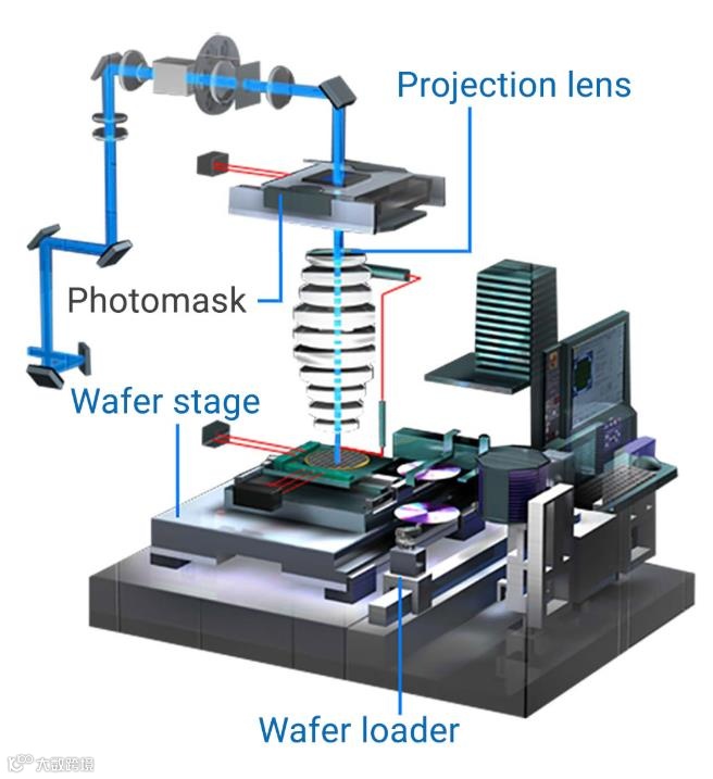 光刻机由光源系统、投影物镜系统和双工作台系统三大核心部分构成,通过光束投射、掩膜成像、精准对准,将电路图案转移到硅片上。
