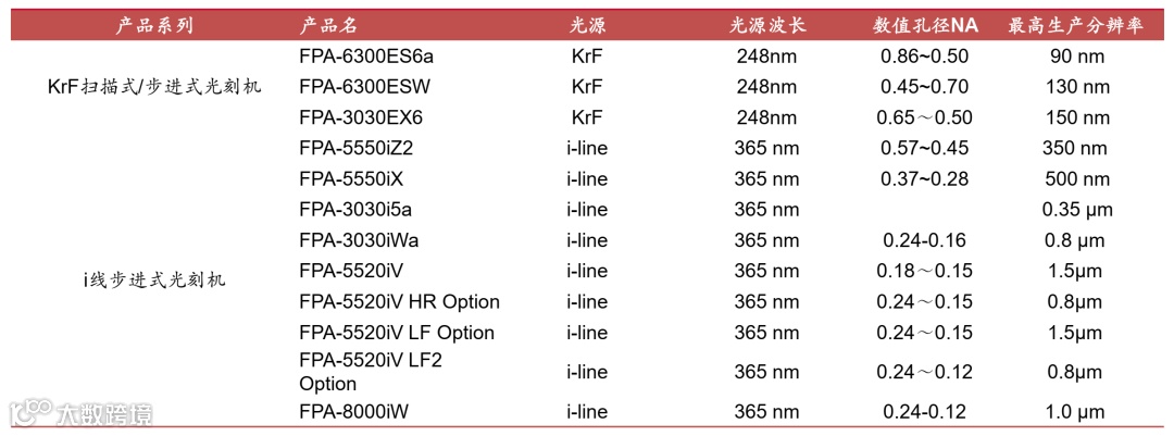Canon主要提供i-line和KrF光刻机,未涉足ArFi、EUV等高端机型,产品分辨率集中在90nm以上,应用于成熟制程与特殊器件领域。