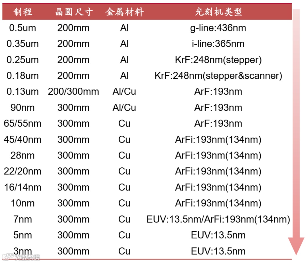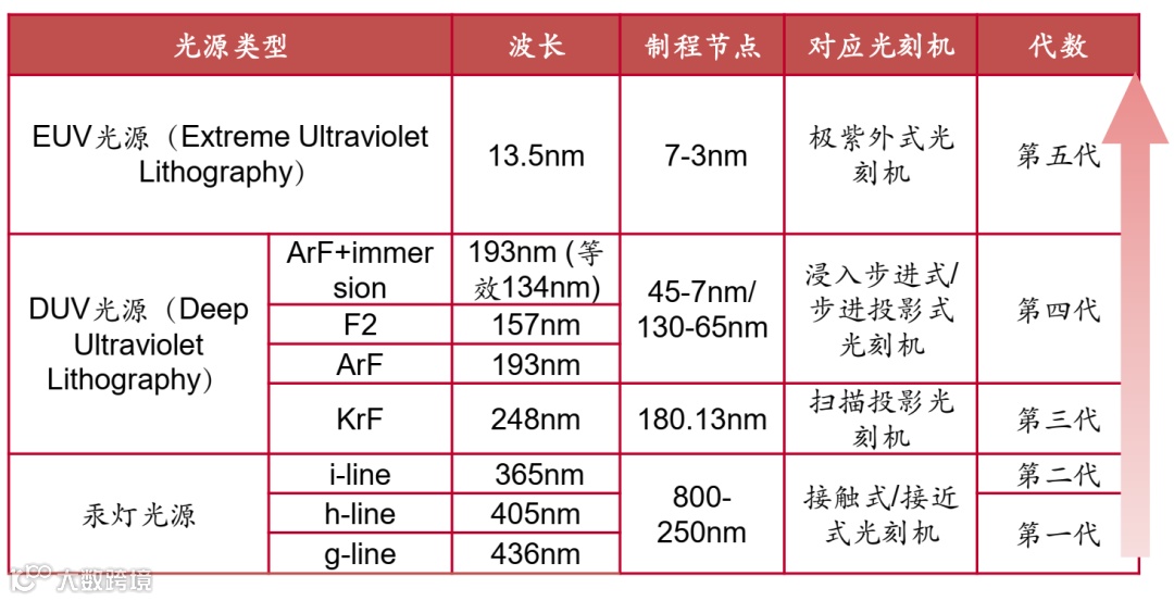 - 深紫外(DUV):KrF(248nm)、ArF(193nm)。