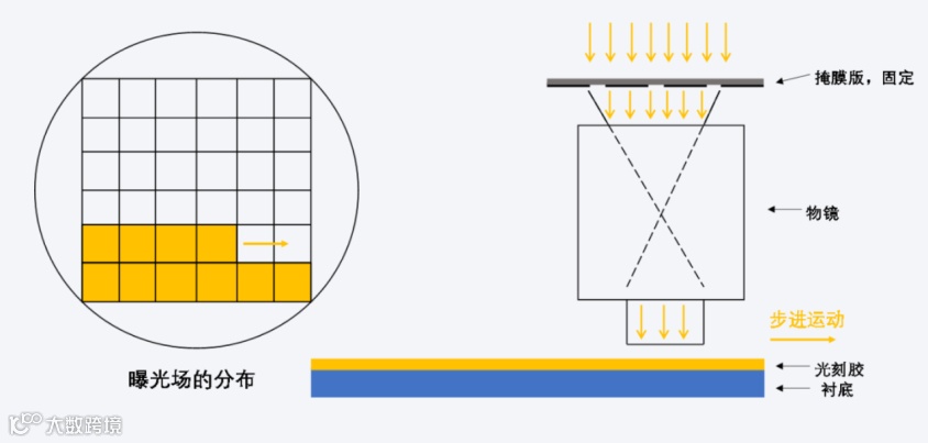 - 步进重复光刻:适用于0.25μm以上工艺,固定掩膜、晶圆步进曝光。