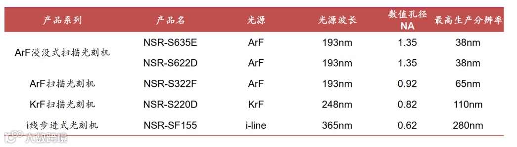 Nikon可生产干式与浸没式DUV光刻机,是除ASML外唯一掌握浸没式技术的厂商,光源波长最小193nm,分辨率支持至38nm节点。
