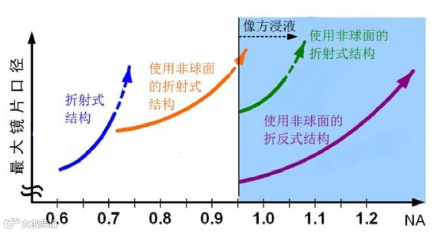 - 增大NA:采用非球面镜、浸没式技术(水介质)、折反式结构。