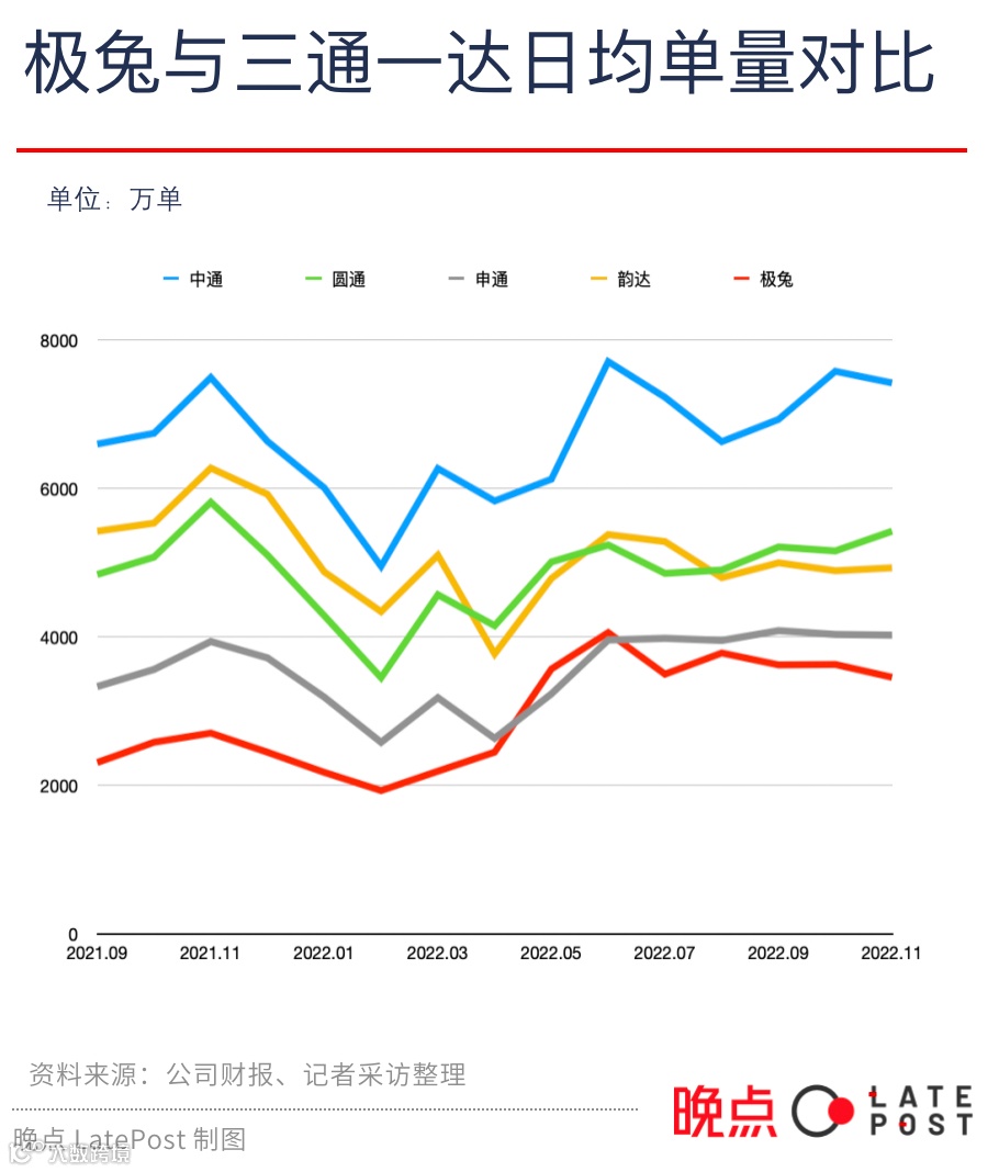 大手笔的收购使得极兔在今年六月单量峰值到达四千万,短暂超过申通,成为全国第四。但叠加疫情管控影响,经济和消费力下行和并网阵痛,前进势头未能持续。据《晚点 LatePost》了解,近半年,极兔单量在 3500 万- 3700 万单之间徘徊。