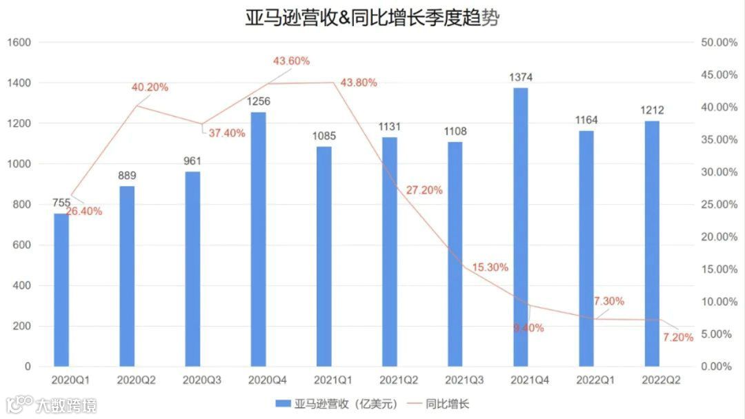 巨额的物流成本下,4月,亚马逊发布2022财年第一季度财报,其中亏损金额高达38亿美元,出现了自2015年以来的首次季度亏损;7月,亚马逊的第二季度财报显示亏损额度有所下降,达到20.28亿美元,但净销售额的同比增长率仅为7.2%,创下近20年来最慢的增长率。