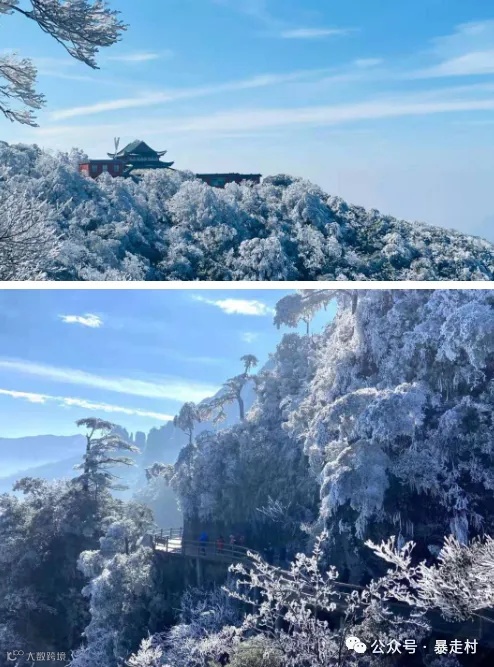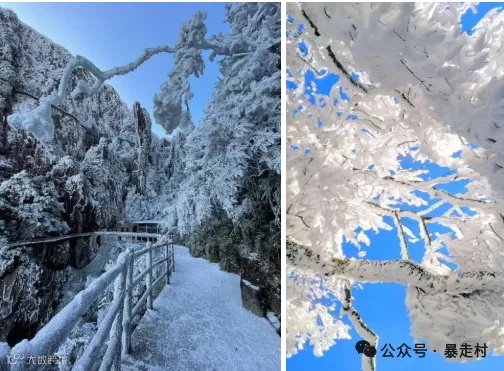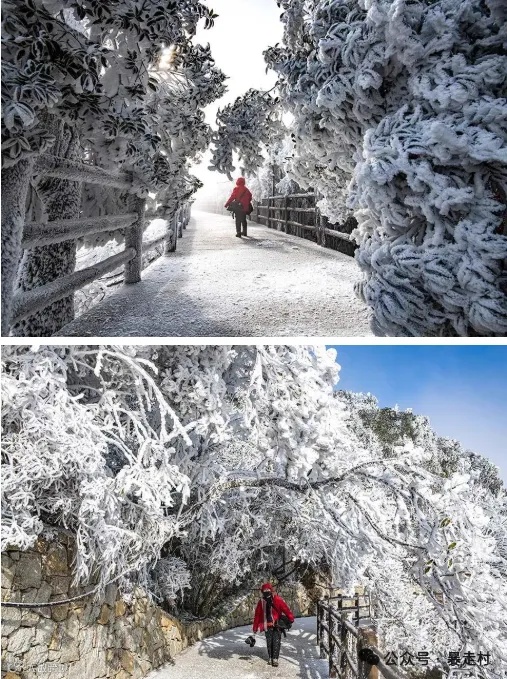 悬空栈道在雾凇装扮下如同通往童话世界的时光隧道,干净、纯粹、壮观而浪漫,莽山五指峰堪称南方冬季旅行首选目的地。