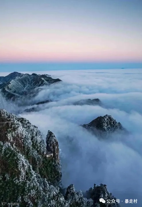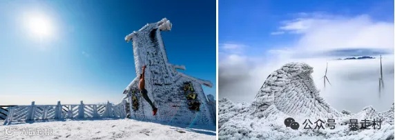 冰挂、冰花、冰柱、冰瀑晶莹剔透,形态各异,在阳光照耀下熠熠生辉。晴天登顶,可观云海翻涌,感受“千里冰封,万里雪飘”的壮阔意境。