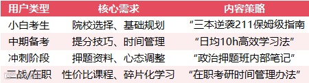 长效期:持续更新“院校分析”“专业课书单”等刚需内容,积累搜索权重与长期流量。