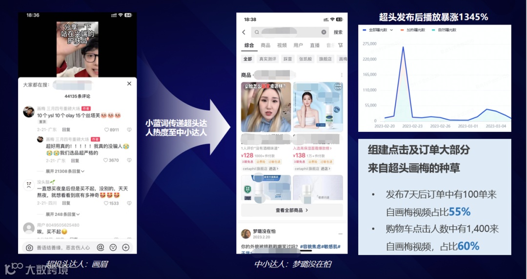小蓝词不仅能提升“看后搜”数据,还可实现头部达人流量向中小达人的反哺。以某面霜品牌(丝塔芙)为例,在MGCC服务过程中,一位超头达人发布未挂车合集内容后,成功触发评论区吸顶小蓝词,带动同期另一位底部达人挂车视频流量飙升1345%。