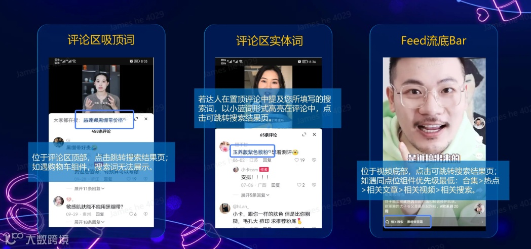 “如果说抖音搜索有捷径,那就是小蓝词。”作为一种高效的内容运营手段,小蓝词具备见效快、易操作的特点。品牌在达人合作中填写期望挂载的搜索关键词后,用户观看视频时,该词将以底bar、评论区置顶词或实体词形式自动呈现。