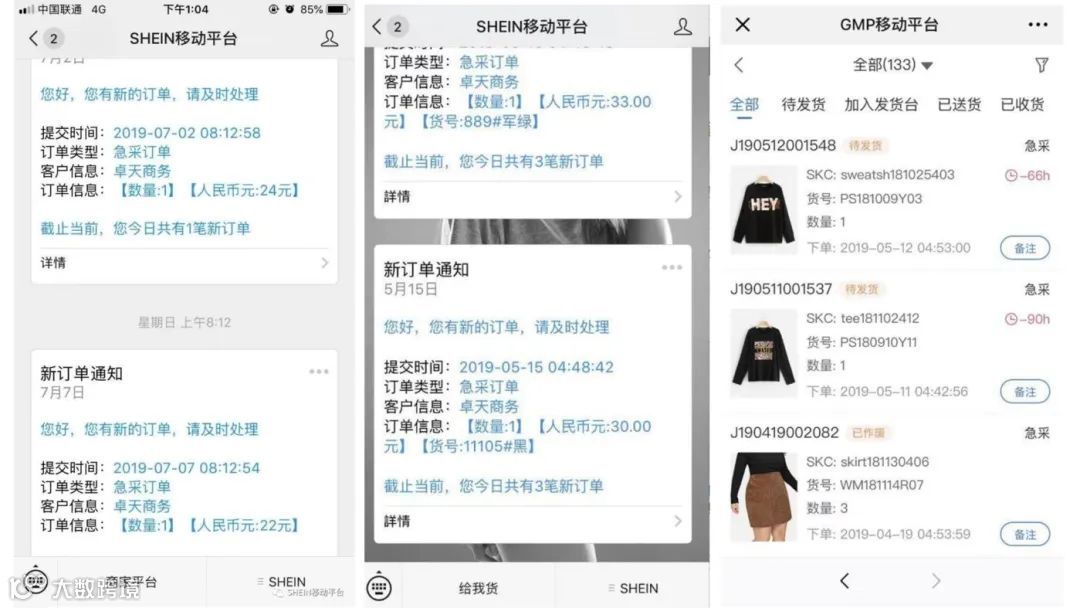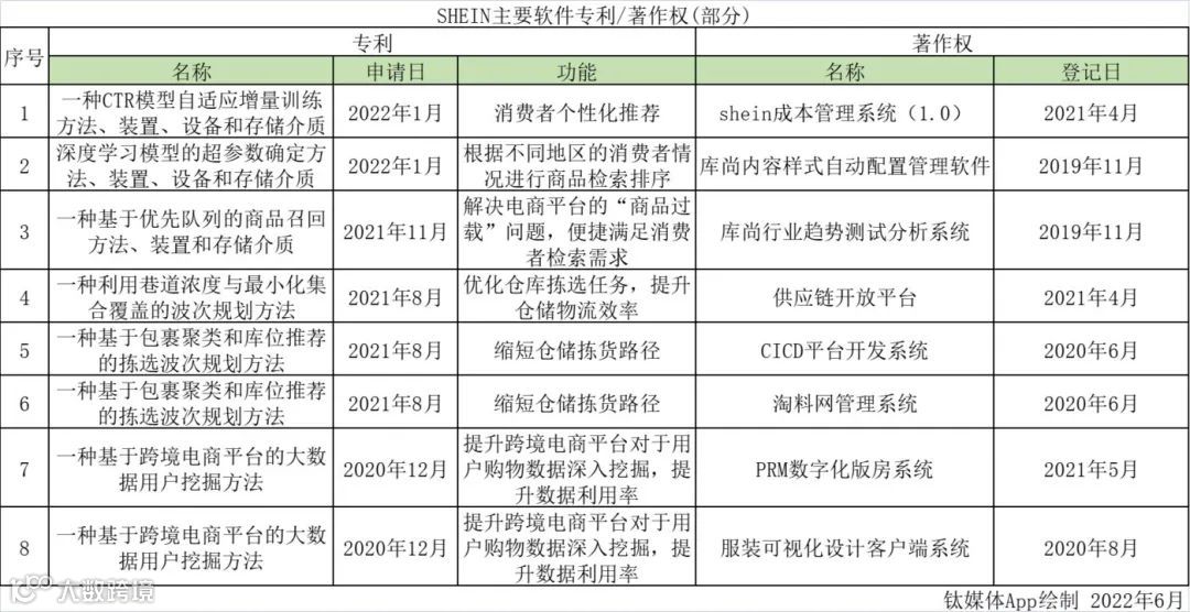 一件衣服的跨境运输,会涉及到两个核心链条,后端供应链和前端供应链。前者指的是衣服从设计到打版、加工成衣,后者则指的是成衣出厂之后,通过何种链路送往消费者手中。在传统情况下,前端链路和后端链路并不互通,或者做不到实时协作。但在SHEIN模式中可以看到,SHEIN的供应链系统,在前后端链路的协作上较为通畅。前后端供应链的打通与SHEIN供应链的数字化能力有很大相关性。钛媒体App通过第三方查询获知,在SHEIN的诸多关联公司中,南京希音电子商务有限公司、深圳库尚信息技术有限公司、广州希音供应链管理有限公司、广州希音国际进出口有限公司四家公司很大程度上承担了SHEIN“CTO”的角色,这四家公司共拥有软件专利/著作权88项。SHEIN 的App、供应链管理系统、线上购物的智能化推荐、流行趋势分析系统、仓储拣货系统、数据挖掘、面料管理、服装可视化、智能营销等核心系统大多来自这四家公司。 表2 来源@钛媒体App 制表技术的应用可以极大影响SHEIN的下行动作。以上图第二条专利“深度学习模型的超参数确定方法、装置、设备和存储介质”为例,其功能是为了根据不同地区的消费者情况进行商品检索与排序。这意味着,SHEIN希望在全球各地的用户登录其全球唯一独立站和App时,可以根据用户所处的地区进行喜好上的个性化推荐。这其实是一种更对技术要求更高的“中心化”策略。钛媒体App曾在《不要忽视Lazada,技术正在成为重构东南亚电商的关键因子 》的文章中对东南亚电商Lazada和Shopee的本地化策略进行了对比。Lazada的策略是投入大量的技术研发以要用一套统一的算法、一个通用入口来应对东南亚的多元化市场。而Shopee的策略是为每个市场提供了各自的电子商务应用程序,他们通过在每个国家铺设本地化团队来应对不同东南亚国家定制的需要。SHEIN的思路同Lazada一致,但是它所面临的用户是全球用户,不同在于Lazada做的是全电商品类,但是SHEIN只在快时尚。SHEIN一出生就诞生在全球互联网飞速发展的时代,因为底层系统在数据沉淀、挖掘等方面具备了一定的基础,所以SHEIN在社交化广告投放时也具备了一定优势。从优衣库和ZARA来说,前者通过投放广告(线下等)来吸引顾客,后者则是投资于门店,靠门店陈列来吸引流量。而SHEIN呢?公开资料显示,SHEIN的获客是通过在Facebook、Twiter等社交平台投放广告、优惠券然后将流量吸引至SHEIN App,他们也会将商品免费邮寄给网红博主,并在试穿后在社交平台分享展示。SHEIN目前可以查到的供应商信息确实也证明,SHEIN的确在购买社交平台流量服务。钛媒体通过第三方渠道查询显示,SHEIN注册地位于香港的母公司卓天商务有限公司(ZORTOP BUSINESS CO.,LIMITED)的供应商列表中,出现了一家名为“易点天下网络科技股份有限公司”,卓天商务于2022年4月采购了该公司服务,采购额为5941.73万元,进一步查询易点天下的主营业务,是为跨国企业提供在Google、Facebook 、TikTok For Business等流量资源上的服务。除了引领网红潮流,在获客上独辟蹊径,SHEIN在快时尚的捕捉速度上也十分“夸张”——优衣库对于时尚潮流的预测一般会在一年前开启,ZARA产品的提案和准备是两个月,而SHEIN对于时尚的捕捉其实是靠全网实时时尚元素的爬取,定款之后,从设计到成衣,SHEIN只用两周,由于不需要发送到线下门店而是SHEIN负责将商品集中运送至海外独立仓,待客户下单就近发货。通过对SHEIN的进一步了解,钛媒体App也发现,上述的这些大大小小的系统都只在底层运作,真正将前端供应链中的消费者与后端供应链中的成百上千家供应商连到了一起的,是一款叫做GMP(中文名称:给我货)的库存管理系统。大概在2019年前后,SHEIN上线了GMP库存管理系统的移动端版本。这使得SHEIN的供应商能够通过微信公众号的形式接受SHEIN发出的待确认版单、打版中、待确认商品信息、下单补货等各种通知。图片来源@SHEIN官方公开图片图片来源@SHEIN官方公开图片这也是为什么在SHEIN的各类招商明细中,能够使用系统、具备快速学习和反应能力成为了一件必须强调的事项。而当市场行情、测款数据、消费者订单等前端供应链各环节能够通过底层系统、前端应用实时回传,这就使得SHEIN小单快返的运营逻辑能够跑通。数字化系统将SHEIN的跨境电商供应链串联到了一起。