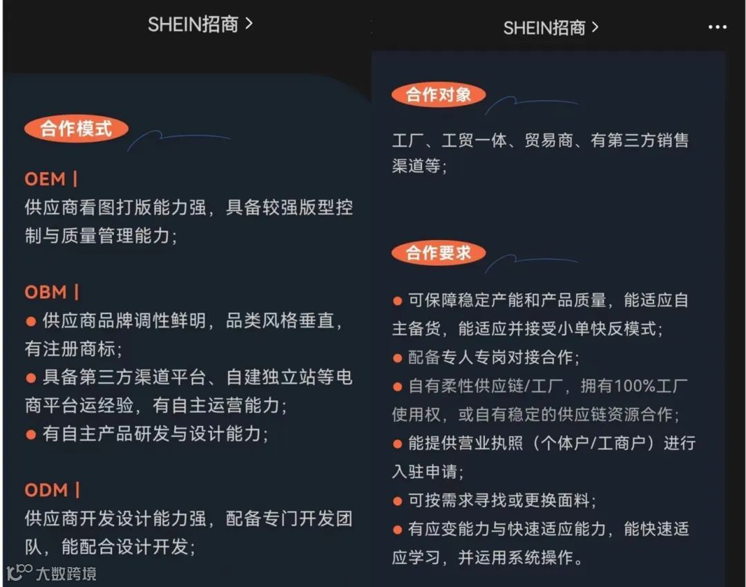 SHEIN的成功被打上了明确的标签——“供应链强大,小单快返”。以此为风向,中国很多跨境电商品牌也想复制SHEIN的成功。什么是“小单快返”?在跨境供应链中,这个词已经近乎封神。在传统制衣供应链中,季节性批量集中采购才能最大程度降低成本。但“小单快返”又刷新认知——要赶上快时尚潮流,一次性大批量采购已经是上一个时代的事了。优衣库和ZARA都创立于20世纪60-70年代,前者发端于日本,后者起家于西班牙。他们的采购模式其实代表了快时尚的早期打法。斋藤孝浩在《优衣库VS ZARA》一书中,就优衣库和ZARA的商业模式和供应链进行了详尽的分析。他把优衣库和ZARA的商业模式都归类为SPA(Speciality retailer of Private label Apparel,自有品牌服装专业零售商),即服装企业自己策划、生产商品,并自己运营门店、销售的一体化经营模式。这一模式完全运用制造和销售垂直一体化的手法。在这一模式下,服装企业可以一边预测消费者需求变化一边策划商品,并把之前有众多企业参与的供应链(从原料采购到把商品送到顾客手上的全过程)全部统合,从而控制商品的供给和销售。出生于21世纪第一个十年的SHEIN,其实也属于SPA模式,只不过没有线下门店,完全采用线上渠道售卖,但相比于SPA,SHEIN还是乐于把这种全链条线上卖货的模式叫做DTC(Direct to Consumer),即直面消费者。所以在具体商业化策略上,SHEIN与优衣库和ZARA都有着本质的不同,这种不同在供应链上也表现得淋漓尽致。虽然三家都对供应链有着强把控,但有的为了方便管理会指定有限的供应商供货,例如优衣库;而有的则是有多类供应商供货,SHEIN把“多供应商供货”发挥到了极致。优衣库的"集中式"生产相对明显,由于走的是基本款路线,优衣库一般会提前一年开始衣服款式的策划,在实际生产上,优衣库会限定商品范围,从而增加每种商品生产的数量,另外也通过减少代工厂数量,增加每个代工厂的订货,以此获得议价权。在最后的商品订货阶段,优衣库会根据每周的销售情况,重估市场需求,以决定追加或停止生产,也就是一边花一年时间定计划,一边每周对商品的生产和销售进行调整。ZARA采用的是少量生产的策略,把毛衣短袖等靠价格、质量定胜负的基本款商品委托给亚洲工厂外包,其他由西班牙葡萄牙等国工厂生产,以实现多种少量快速。即先生产少量供门店货架摆放用的商品,然后根据顾客反馈情况再决定是否追加生产。ZARA最初的产品提案和原材料准备需要历时2个月,但因为自主设计和生产,每次追加生产平均只需要3个星期,因此一季周转3次。但是SHEIN的制衣订单基本是分散在成百上千家中国供应商手中,他们大多集中在广州番禺的中小型制造工厂,SHEIN对这些供应商的一次下单可能只有百件到几百件,在筛选供应商时SHEIN也会要求供应商能够接受100件-500件的小订单,即新款先行小批量上线测款,根据市场反馈,多次追加小批量订单。也就是已经在服装供应链领域小有盛名的“小单快返”。表1 来源@钛媒体App制表为了避免仓库多次发货产生爆仓、断货的状况,SHEIN后来推出了JIT(Just In Time,准时制)的发货模式。如表1,一款新品上线,SHEIN运营会根据新品情况先行向供应商下一个300件的订单,但这300件不会要求供应商一次性发出,而是按照10+7/15+7/18+7的逻辑多次触发送货,触发的条件是周销≥30件。据了解,SHEIN能够触达的中国供应商数量在1000+,其在对2021年Q1供应商大会做总结时,披露了这一数据。同时公开数据也显示,真正围绕SHEIN在广州番禺设工厂的核心供应商大概在300-400家。如果按照每日3000款新品、每类新品300单计算,SHEIN一天新单下单量会达到9万件,在不考虑其他因素之下,SHEIN一个月会产生近270万新单,而一家中小工厂的全部产能可能在30万—40万。有SHEIN供应商表示,在产品销量好、有可能成为爆款的情况下,有时候第一批货还没有做完,下批货就已经下单了。这种柔性的碎片化订单,虽然会提升供应商的制作成本,但好处在于,SHEIN回款快,新供应商月结,随着供应商等级的提升,最快可以实现货款周结,这也是吸引供应商愿意跟SHEIN合作的原因之一。图片来源@截取自SHEIN招商官方公众号 除了有OEM(买手发图,看图打版)、ODM(自主开发设计)的合作模式,SHEIN也支持OBM模式,即供应商具有自主品牌和商标。这也是明显区别于优衣库和ZARA的地方。目前已知的第三方入驻有unifee、jazzevar、genanx等在淘宝也拥有店铺的品牌。品牌合作方越来越多,可能也是SHEIN逐步从日上新200+,到日上新2000+,再到现在日上新能达到5000+的重要原因。