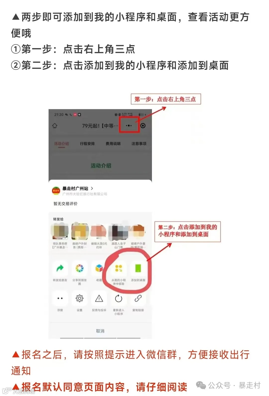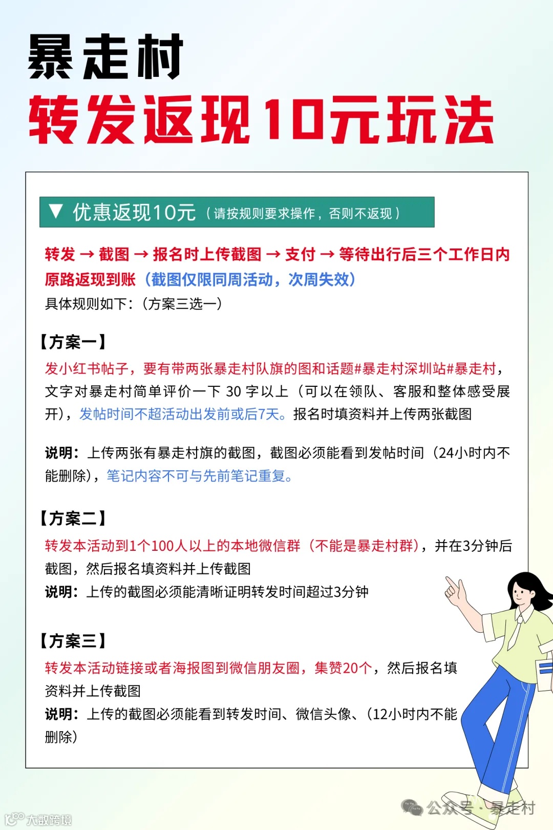 将本活动转发至100人以上的微信群(非暴走村官方群),3分钟后截图,报名时上传截图并完成支付,出行当天可获10元原路返现。