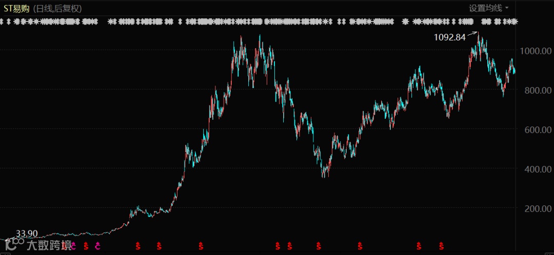 如果时间能够静止,苏宁易购的投资人希望是2015年。这一年的6月15日,其股价(后复权)上涨至1944元的历史最高峰,上市以来上涨了57倍,是中小板涨幅最大的上市公司。