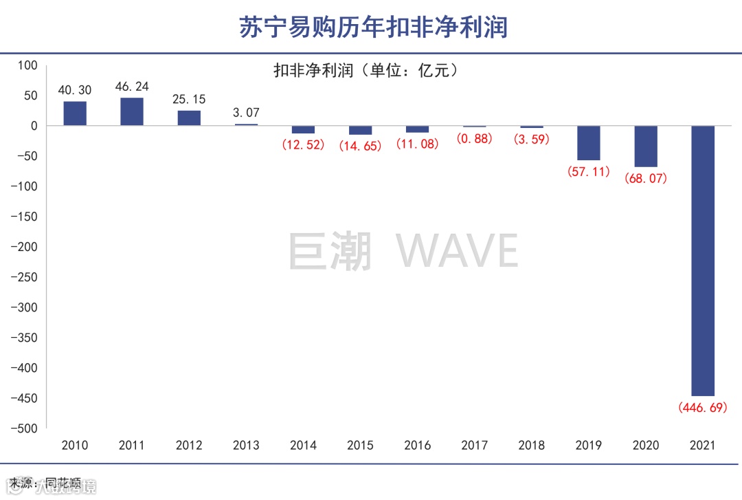 过去八年,苏宁易购扣非净利润持续亏损,合计高达615亿元,亏损数额是当前市值的整整3倍。也就是说,以股权价值衡量,要把苏宁易购卖掉三次才能弥补这些亏损。