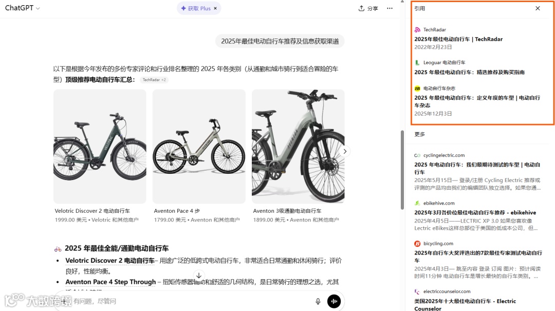 以“2025年度E-bike推荐”为例,ChatGPT所引用的文章多以《2025年最佳电动自行车》为题,印证了从用户角度设定选题的重要性。