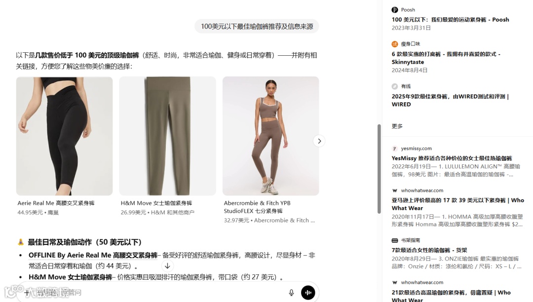 例如,在ChatGPT中输入“100美元以下的瑜伽裤推荐”,生成的8款产品分别来自女性时尚垂直博客Poosh、瘦身食谱博客Skinnytaste以及顶级生活方式媒体Wired。内容中不仅引用医生建议,还包含编辑实际试穿体验,有效突出了产品的差异化特点,从而提升了被AI引用的可能性。