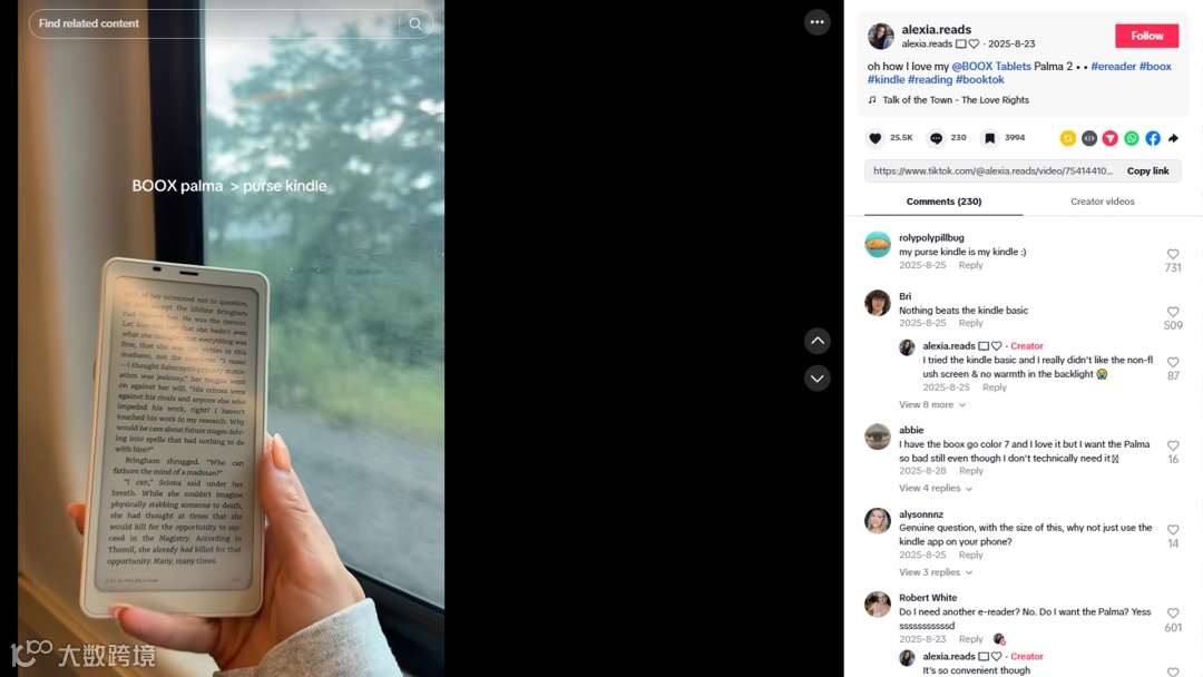 她的视频虽然只有短短10秒,却收获了50多万播放和2万多互动。只因在视频中她将BOOX Palma 2自然融入车窗场景,一边滑动翻页,一边是背景中的沿途街景,营造出放松惬意的氛围感,再配合优雅的BGM,让整个视频代入感极强,仿佛身临其境,产生“我也想体验这一刻”的共鸣。