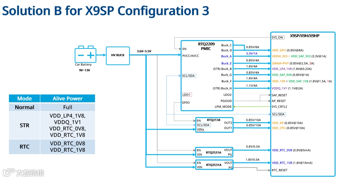 适用于无MCU、采用LP4 DRAM的系统,电源方案由RTQ2209+RTQ2134+RTQ2531A组成。由X9系列SoC通过GPIO和I2C控制RTQ2209与RTQ2134运行。RTQ2209为SAF、DRAM、GPU等供电,RTQ2134为AP、CPU供电,RTQ2531A为RTC域供电。