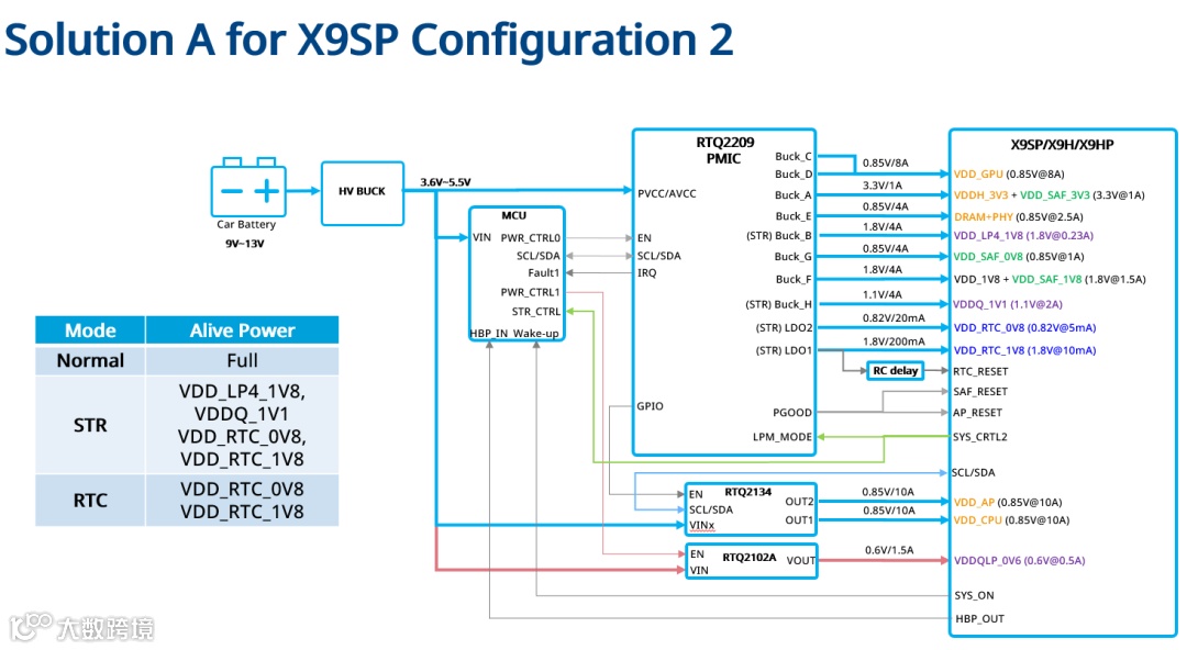 适用于无MCU、采用LP4x DRAM的系统,电源方案由RTQ2209+RTQ2134+RTQ2102A+RTQ2531A组成。X9系列SoC通过GPIO和I2C控制前三颗芯片运行。RTQ2209为SAF、GPU和LP4x供电,RTQ2134为AP、CPU供电,RTQ2102A专供LP4x,RTQ2531A为RTC域供电。