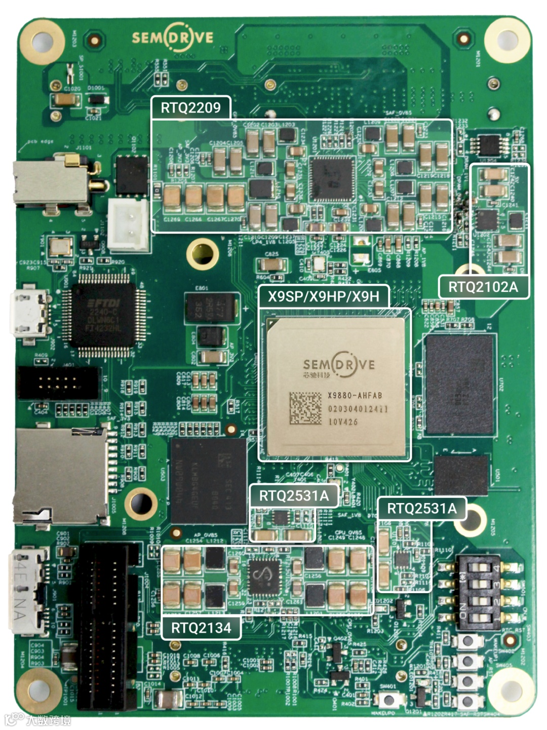 “SD210”基于芯驰X9H、X9HP和X9SP智能座舱SoC,搭载立锜RTQ2209(SoC PMIC)、RTQ2134(多相降压转换器)、RTQ2102A(DCDC)和RTQ2531A(LDO),支持通过IC内部存储器(MTP/OTP)配置输出电压与时序,供电灵活高效。各SoC引脚兼容,便于在不改电路的前提下快速切换规格。