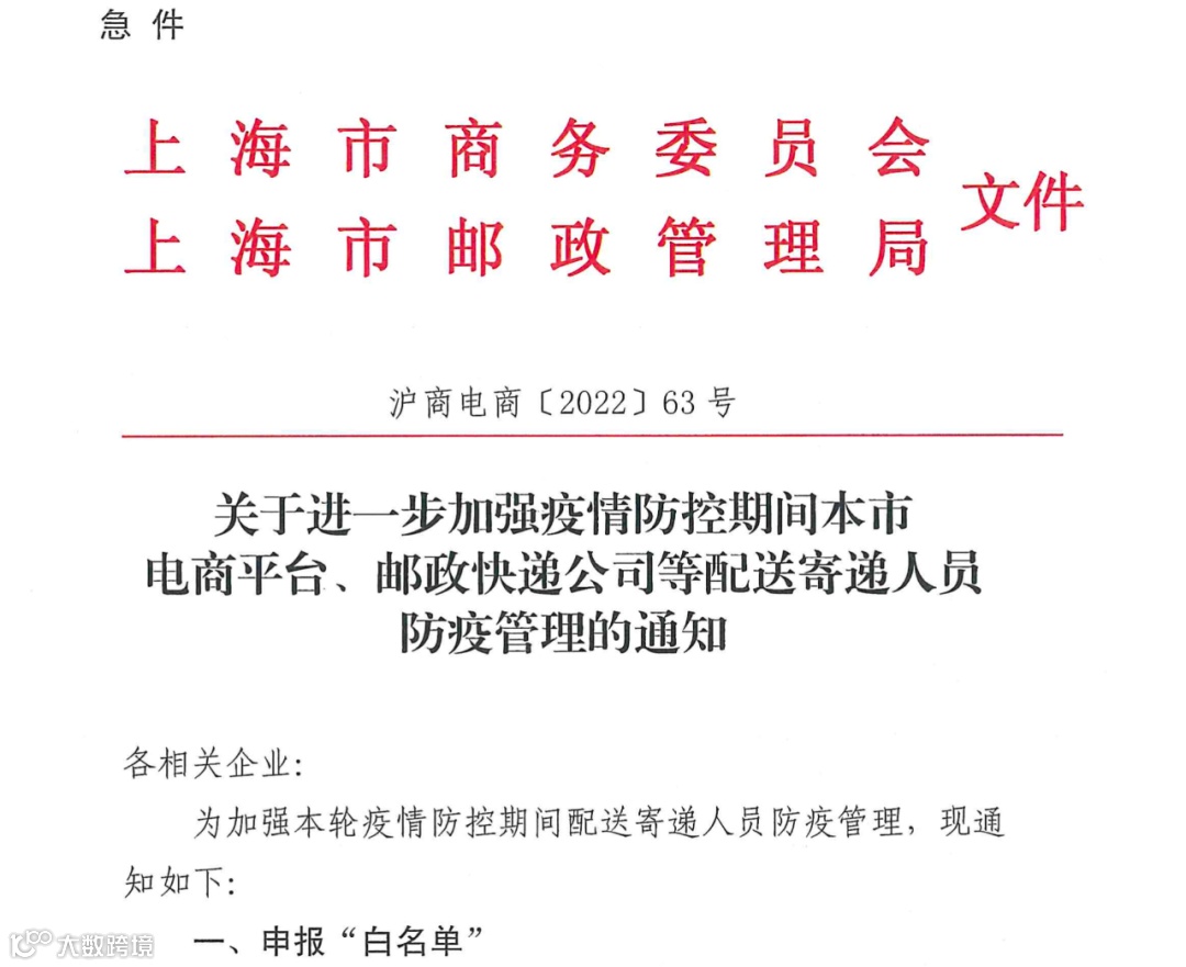 4月22日,上海市人民政府官方公布《上海市商务委员会、上海市邮政管理局发布关于进一步加强疫情防控期间本市电商平台、邮政快递公司等配送寄递人员防疫管理的通知》。