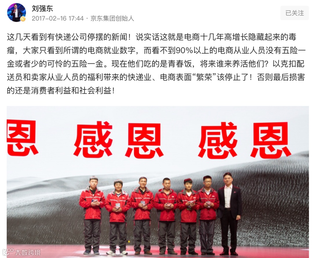 刘强东透露出一组数据:在2017年京东为兄弟们缴纳了60亿的保险和公积金!缴纳的税收更多!!我们坚持全员全额缴纳五险一金!如果通过劳动外包或者少缴,一年至少可以多赚50亿人民币!