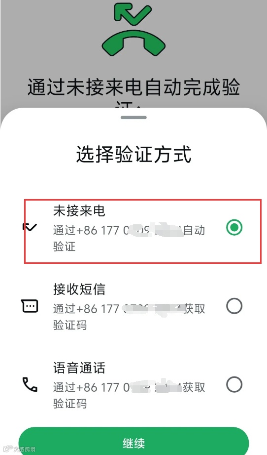在 WhatsApp 的注册屏幕上点击未接来电。此类通话在你的通话记录中显示为来自未知号码的未接来电或被拒来电。你可能不会注意到手机响铃。