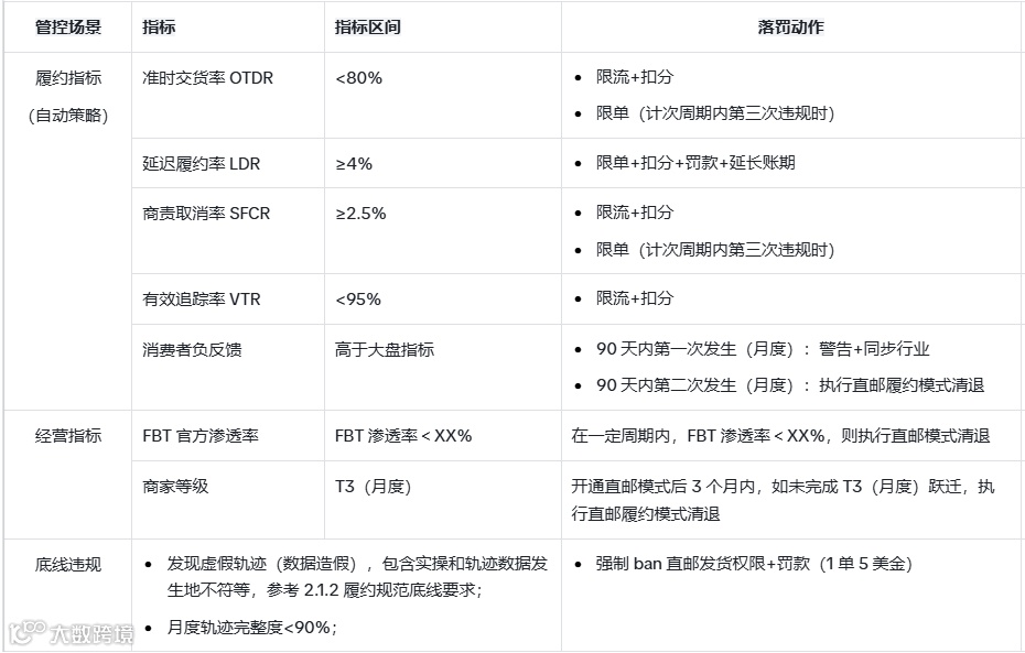 - FBT全店渗透率:商家须在规定周期内达到平台设定的FBT(TikTok官方仓配一体化服务)渗透率目标(具体数值以AM通知为准),未达标将取消直邮权限;
