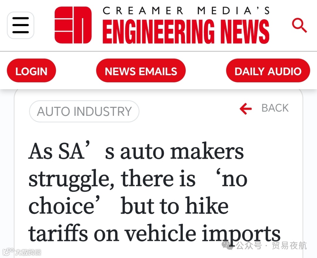 整车关税:目前南非进口关税约为25%,计划最高提升至50%。