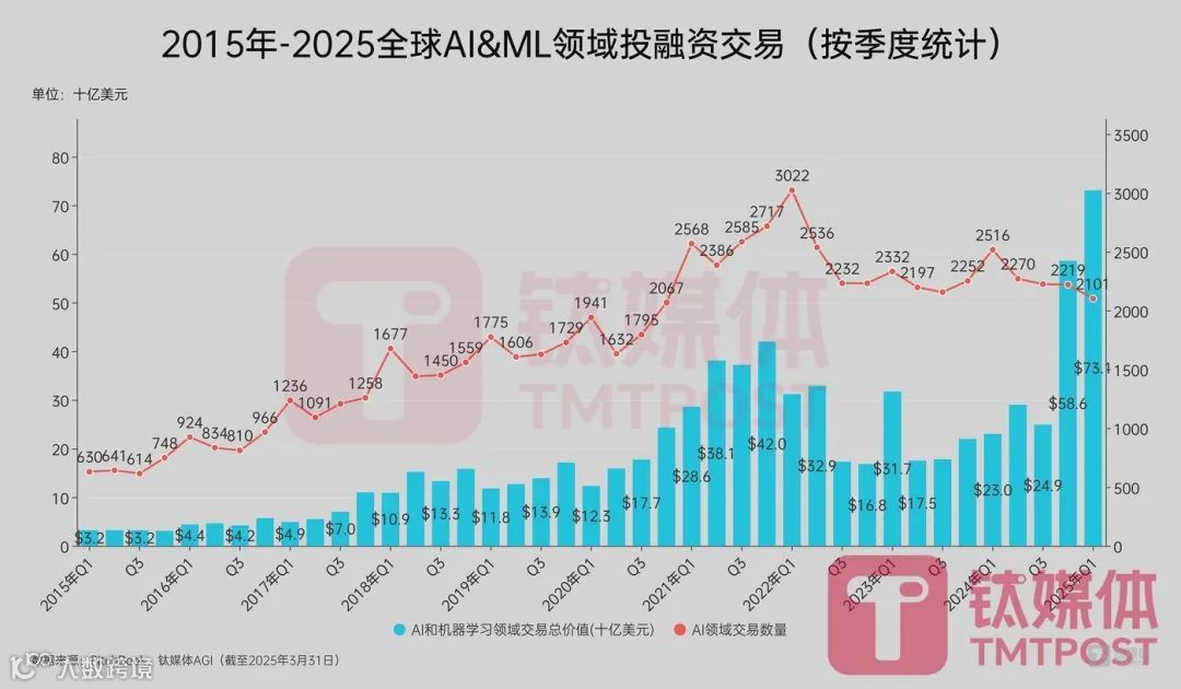 Crunchbase报告数据显示,2025年第一季度全球初创公司融资总额达1130亿美元,同比增长54%,环比增长17%。其中,AI领域融资596亿美元,占比53%。