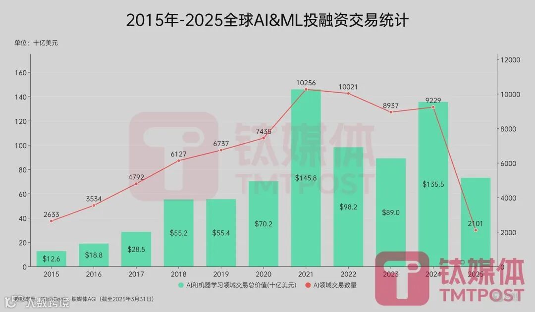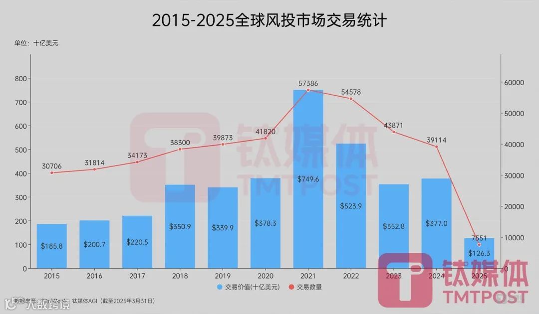 PitchBook报告显示,2025年第一季度,全球风险投资交易数量达7551件,同比下降约32%;交易总价值达1263亿美元(约合人民币9180亿元),同比上涨约53.46%。